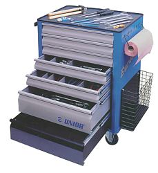 Alle Rollen und Führungen kugelgelagert abschließbar durch stoßgesichertes Zentralschloß mit 2 Schlüsseln, stabiler Führungsgriff und gleichzeitig Rammschutz, gegen Herausfallen gesicherte Schubladen mit ölbeständigen Antirutschmatten, davon 5 schubladen für Elektrowerkzeuge, Stahlbügelhalter mit Putztuchrolle, Abfallkorb, stabile Rollen, davon eine mit Arretierbremse, große und belastbare Ablagefläche (700 x 450 mm) mit Randbegrenzung gegen Herunterfallen von Werkzeug